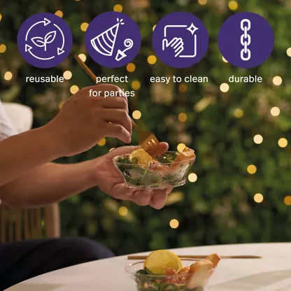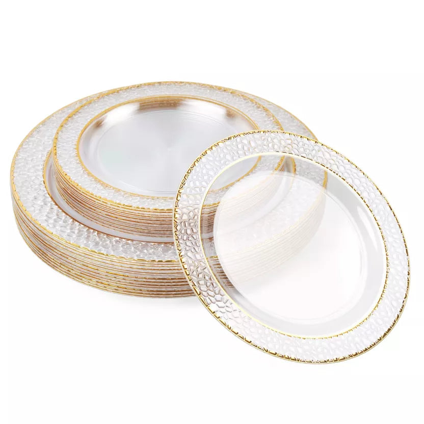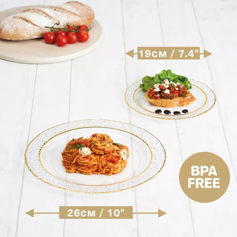 Platos transparente premium con borde dorado martilla 19 cm postre