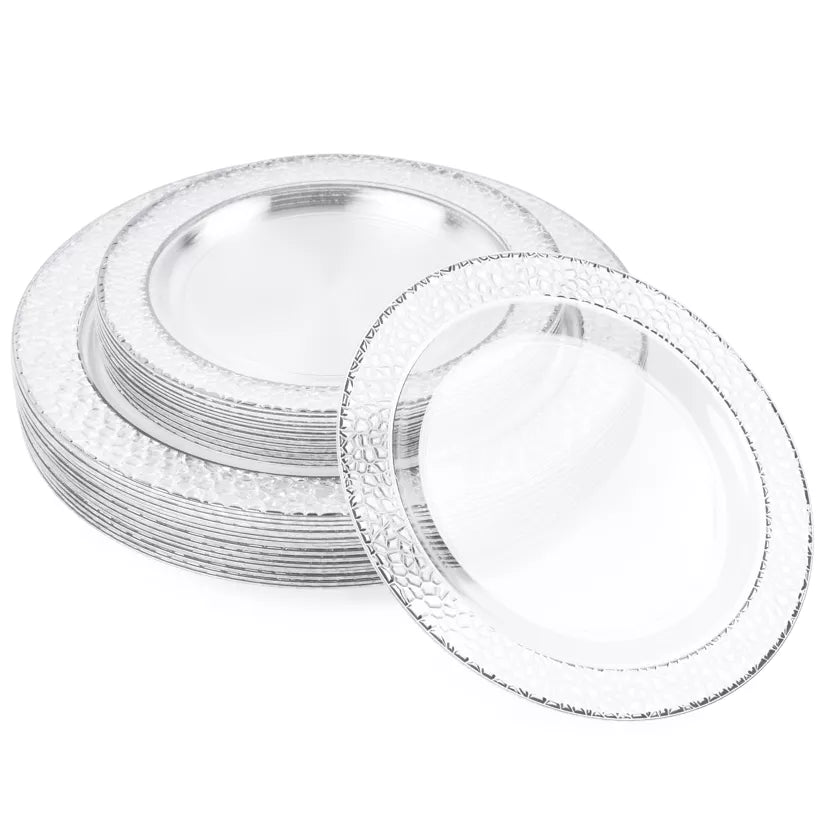Platos transparente premium con borde plateado martilla 19 cm postre